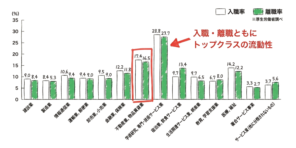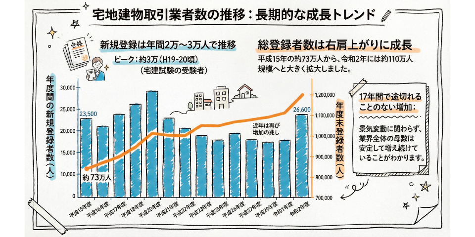 令和2年3月末(令和元年度末)現在での宅地建物取引業者は、大臣免許が2,603業者、知事免許が123,035業者で、全体では1,187業者(1.0%)増加し6年連続の増加となっています。しかしながら入職と離職の数値差が1.1と非常に低く、離職率が他業種に比べ高いため、社内教育や人材育成のコストが問題になっています。