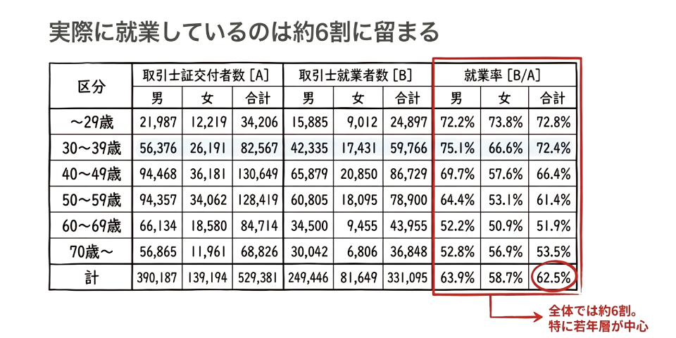 資格保有者の高齢化のみならず下記の表の赤枠で示すとおり、約40%前後の割合で宅建取得者だが就業していない方が数多くいます。登録者数(平成30年度時点)は、50代が最も多く約20%を占めています。続いて60代の18.9%、40代の18.5%と高齢化している状況です。そして20代以下は3.1%、30代は10.5%と構成比率は低いです。
