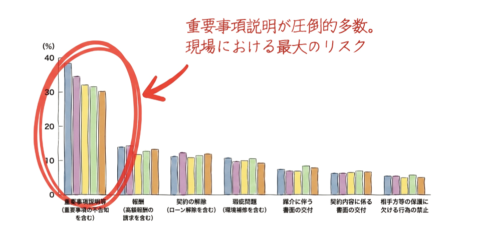 免許取り消しや業務停止処分につながるようなトラブルの半数以上の原因は、契約書や重説の不備によるもの。売買契約に関する重要事項の説明が不十分で、引き渡し後トラブルに発展したり、契約を解除しようとしたら想定外の違約金を請求されたりする事例が、多く発生しています。近年は特に重要事項の説明のトラブルの推移が横ばい最多となり、その結果、毎年150〜200人が処分対象になっています。